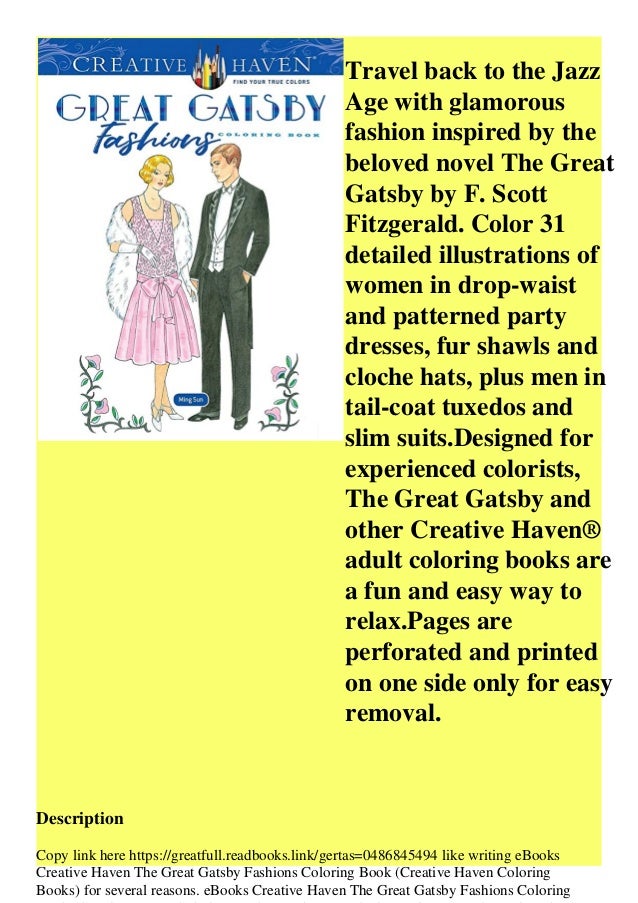 Amazon Com Creative Haven The Great Gatsby Fashions Coloring Book Creative Haven Coloring Books 0800759845491 Sun Ming Ju Books from m.media-amazon.com Scott fitzgerald's famous novel, is one of the greatest pieces of literature out there. Great for new teachers, student teachers , homeschooling and teachers who like creative ways to teach. Scott fitzgerald, is discusses social classes, and focuses on the theme of a gatsby's figure is greatly shaped by this color imagery, validating and supporting the title of the book, colors show how great the great gatsby was. Character color analysisthe great gatsby, written by f. Scott fitzgerald's book the great gatsby, he combines the history along with the idea of the wealthy being in control. Jay gatsby, as described in the great gatsby, is a very vibrant character. The great gatsby is a 1925 novel by american writer f. Green symbolizes optimism, hope, and vitality in the novel.